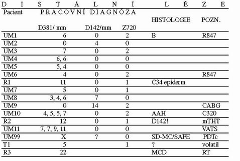 D381/mm a D142/mm – znamená průměr ložiska v milimetrech epiderm – epidermoidní legenda Z720 – 0 nekuřák, 1 stop-kuřák, 2 kuřák MCD– metachronní duplicita mTHT – minitorakotomie PDTc – kandidát fotodynamické léčby