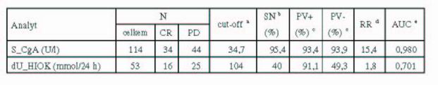 Klinická validita vyšetření chromograninu A ve srovnání se stanovením hydroxyindoloctové kyseliny v moči je uvedena v tab.1. Z výsledků je zřejmé, že senzitivita, pozitivní i negativní prediktivní hodnota a především relativní riziko je výrazně vyšší u chromograninu A než u kyseliny hydroxyindoloctové. Rovněž plocha pod ROC křivkou, která vyjadřuje vztah mezi senzitivitou a specificitou stanovení, má lepší charakteristiky pro tento parametr. Stanovení sérových koncentrací NSE v našem souboru karcinoidů vykazuje na menším souboru vyšetření velice nízkou senzitivitu.