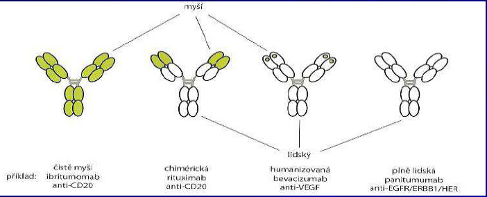 - Chimerické (60-70 % lids.bílkovina 30-40 % myší komponenty) -“ximab“