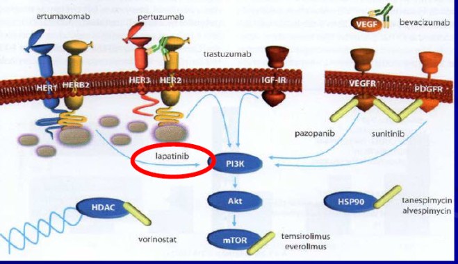 - Vazbou na receptory lapatinib inhibuje kaskádu informačních dějů vedoucí k růstu a proliferaci nádorových buněk
