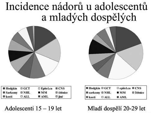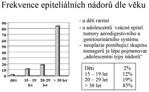 Incidence nádorových onemocnění má ve skupině adolescentů a mladých dospělých stále stoupající trend, výskyt zhoubných onemocnění je častější než u dětí. Nicméně výsledky léčby u dospívajících, i když se jedná většinou o tzv juvenilní typy nádorů, nekopírují pozitivní výsledky dosažené v dětské onkologii. Spektrum nádorů u dospívajících se liší od spektra nádorů v dětském věku, nicméně karcinomy a tzv typické nádory dospělého věku jsou v této věkové kategorie vzácné. GRAF č. 1 – spektrum nádorů dle věku, GRAF č. 2 – zastoupení epiteliálních nádorů dle věkových skupin.