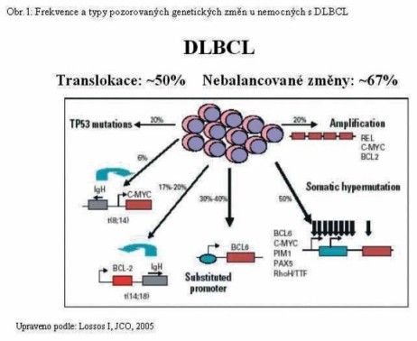 Molekulární patogeneze DLBCL zahrnuje různé chromosomové translokace, aberantní mechanismy somatické hypermutace, genové mutace, delece i amplifikace, které se na vzniku a vývoji DLBCL podílejí (Obr.1).