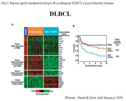Expresní profilování (Alizadeh et al, 2000; Rosenwald et al, 2002) potvrdilo existenci dvou, později tři expresně rozdílných podskupin DLBCL (Staudt & Dave, 2005). Podskupina označená CGB - DLBCL se vyznačuje expresí genů charakteristických pro normální B buňky germinálních center (GC signature genes), zatím co podskupina ABC DLBCL exprimuje geny charakteristické pro in vitro aktivované periferní B lymfocyty. Třetí podskupinu (5% všech agresivních lymfomů) tvoří nemocní s primárním mediastinálním lymfomem (PMBL) s expresí genů odlišnou od obou podskupin (Obr. 2).