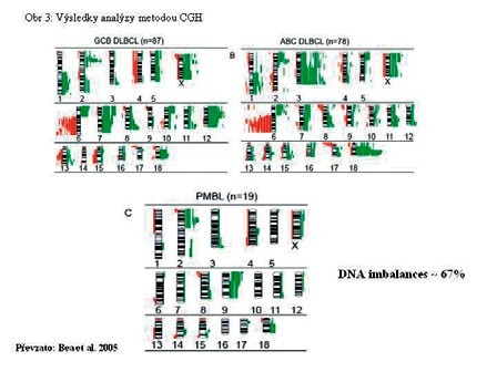 Je otázkou, zda jsme schopni bez expresního profilování nemocné takto diferencovat. V roce 2005 se pokusil tým pracovníků vedený Silvií Bea (Bea et al, 2005) analyzovat 224 nemocných s DLBCL, kteří byli rozděleni do prognostických podskupin na základě expresních profilů. K analýze chromosomových nebalancovaných změn použili metodu komparativní genomové hybridizace (CGH). Tato molekulárně cytogenetická metoda dovoluje určit nebalancované změny, delece a amplifikace chromosomových oblastí s rozlišením 5-10 Mb (megabazí).