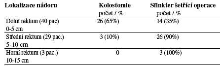 - Sfinkter šetřící operace byla provedena u 43 (60%) nemocných, kolostomie u 29 (40%) pacientů. Zastoupení jednotlivých chirurgických zákroků vzhledem k lokalizaci karcinomu rekta je uvedeno podrobněji v tabulce.