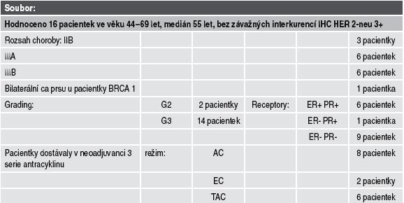 Pokusili jsme se tyto literární údaje ověřit na našem souboru HER 2 pozitivních (IHC) pacientek, kde jsme zpětně při disseminaci prováděli stanovení HER 2 a TOP II a v referenční laboratoři Olomouc(DAKO fish).