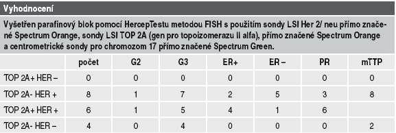 Závěr: Zvýšená amplifikace TOP 2A byla detekována většinou souběžně se zvýšenou amplifikací HER 2, pacientku s pozitivní TOP 2A a negativní expresí HER 2 jsme nezachytili.