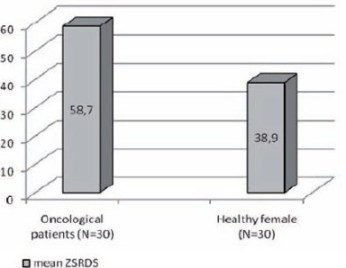 Graph 1. Comparison of values of mean ZSRDS in metastatic ovarian cancer survivors and healthy females (N = 60, p < 0.05)