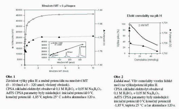 Námi popsanou velmi senzitivní metodiku AdTS CPSA pro stanovení MT jsme dále využili ke stanovení MT ve složité biologické matrici (jako model nám posloužila lidská moč a krevní sérum). Nejdříve jsme se pokusili stanovit MT v moči. Zjistili jsme, že s narůstající osmolalitou moči dochází k poklesu signálu MT a pík MT se také posouvá k negativnějším potenciálům.