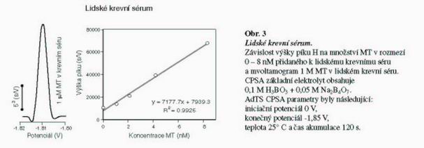 Nedávno bylo zjištěno, že hladina MT se mění u závažných onemocnění jater, jako je hepatocelulární karcinom, chronická hepatitida a cirhóza jater. Hladina MT byla stanovena pomocí ELISA po kyselé a tepelné úpravě vzorku. My jsme se rozhodli využít naší AdTS CPSA techniky pro stanovení MT v lidském krevním séru. Nejdříve byl vzorek tepelně denaturován a po centrifugaci byl odebraný supernatant použitý pro analýzu MT. Vzorek byl před vlastní analýzou naředěn 1000x a následně manalyzován v 5 µl kapce. V případě analýzy více koncentrovaného vzorku dochází k poklesu píku o 25 % (v porovnáním s 10x ředěným vzorkem), pravděpodobně v důsledku adsorpce na povrch HMDE. Do takto připraveného vzorku krevního séra jsme přidávali rozdílnou koncentraci MT (Obr. 3). Získali jsme velmi dobrou lineární závislost standardního přídavku na zvyšující se koncentraci MT (y = 7177,7x + 7939,3; R2 = 0,9925). Limit detekce se pohyboval kolem 350 fmol. V námi testovaných vzorcích lidského séra byla zjištěna průměrná koncentrace MT 1,1 ± 0,015 µM (n=5). Na obrázku Obr. 3 je ukázán chronopotenciogram odpovídající 1 µM MT koncentraci.
