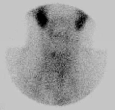 Celotělová scintigrafie 131J : Ložisko akumulující radiojód v krční oblasti odpovídá reziduální tkáni štítné žlázy v lůžku pravého laloku. Jinak fyziologická distribuce aktivity radiofarmaka. Distanční meta neprokázány.