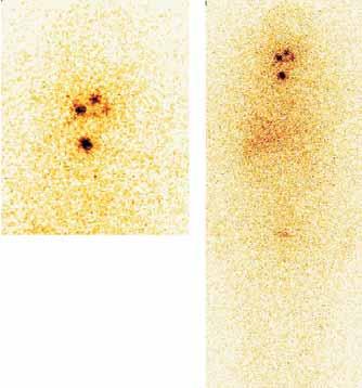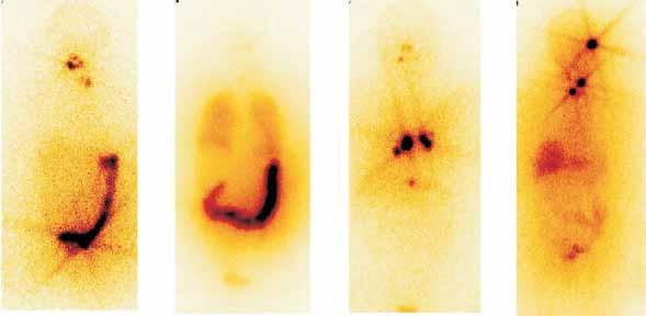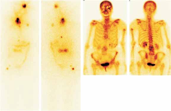 Postterapeutická scintigrafie s 131J (1.2.): Rozsáhlá lokální recidiva , uzliny v mediastinu. Vícečetné metastázy ve skeletu korespondující s nálezem na scintigrafii skeletu s 99mTcMDP (3.,4.) .
