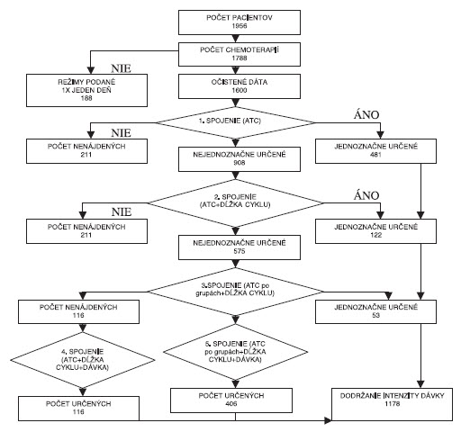 Súčasťou príspevku je navrhnutý a otestovaný algoritmus, hodnotiaci klinickú závažnosť rozdielov medzi režimami, implementovaný na dáta Masarykovho onkologického ústavu za obdobie 02.01.2007 až 11.09.2009. Dáta pozostávajú z 1956 záznamov pacientov a 1788 aplikovaných chemoterapií. Po následnej korektúre a analýze sú dáta porovnávané na základe názvu, dátumu podania a veľkosti dávky aplikovaných cytostatík so štandardnými chemoterapeutickými režimami. Tie sú čerpané z elektronickej knižnice projektu DIOS a po porovnaní s odbornou literatúrou sú podrobené sumarizácii, revízii a analýze za rok 2008, 2009 a 2010. Algoritmus je navrhnutý v jazyku PL/SQL (Procedural Language/Structured Query Language) a získané dáta sú spracovávané pomocou databázového software-u Oracle.