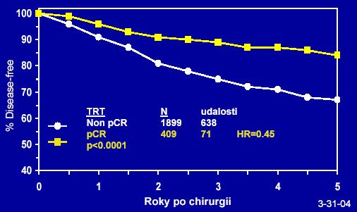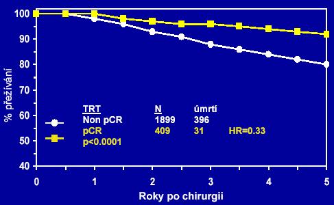 - Signifikantně lepší DFS a OOS u pacientek s pCR nezávisle od léčby ( pCR 82,5% vs No pCR 66,4%)