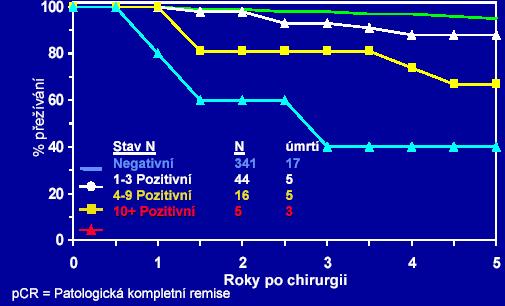 - Počet postižených uzlin je nezávislým prediktorem OS a DFS nezávisle na dosažení pCR