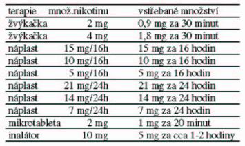 Od začátku 80. let se používá nikotinová žvýkačka, nyní existuje šest forem NTN: žvýkačka, náplast, nosní spray,inhalátor, tablety a pastilky. U nás je k dispozici žvýkačka(2 a 4 mg), inhalátor (10 mg), náplast (5, 10 a 15 mg/16h a 7, 14 a 21mg/24h) a sublingvální tablety (2 mg). Viz tab. 7.