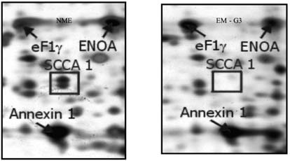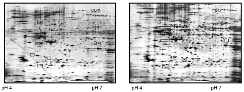 normálních (NME) a nádorových (EM-G3) buněk. Tyto 2DE mapy jsou