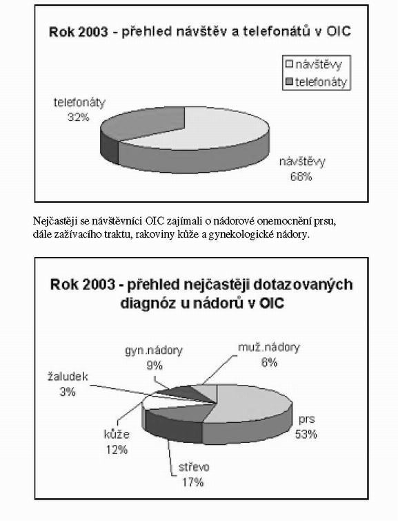 - velikou pozornost věnuje MOÚ a potažmo pracovnice Edukačního centra laické veřejnosti. Nejen pro ni je v ústavu k dispozici Onkologické informační centrum (slouží jak pacientům, tak jejich příbuzným), které je otevřeno každý všední den od 8.00 do 15.00 hodin. Ve stejnou dobu je tady dostupná ze všech míst republiky bezplatná nádorová telefonní linka 800 222 322. Díky zázemí, které v ústavu je, je linka zaměřena na onkologická onemocnění obecně, nemá žádné úzké vymezení. V OIC pracují zkušené zdravotní sestry, které se příchozím individuálně věnují. OIC v roce 2003 navštívilo 1 577 lidí – je to o celou třetinu více než v roce 2002, bezplatnou telefonickou linku (800 222 322), která tady funguje, využilo 751 lidí (v roce 2002 to bylo 573).