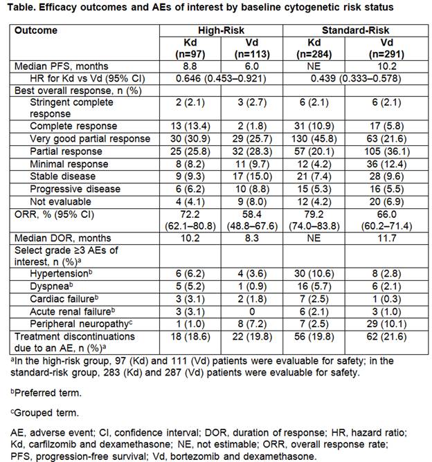 Conclusion: As expected, median PFS for patients with high-risk cytogenetics was lower compared with the overall population; however, patients treated with Kd had a clinically meaningful improvement in PFS compared with Vd in patients with high- or standard-risk cytogenetics. Higher response rates, a greater depth of response, and longer DOR were also observed with Kd vs Vd across cytogenetic subgroups. Kd had a favorable benefit–risk profile in patients with high-risk relapsed MM, and was superior to Vd, regardless of baseline cytogenetic risk status.