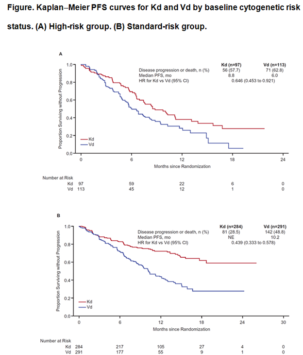 Results: A total of 929 patients were randomized (Kd: 464; Vd: 465). Baseline cytogenetic risk status was well-balanced between the treatment arms (high-risk: Kd, 20.9%; Vd, 24.3%; standard-risk: Kd, 61.2%; Vd, 62.6%; unknown: Kd, 17.9%; Vd, 13.1%). Efficacy end points by baseline cytogenetic risk status are presented in the Table; Kaplan-Meier PFS curves by baseline cytogenetic risk status are shown in the Figure. Median PFS in the high-risk group (n=210) was 8.8 months (95% CI: 6.9–11.3) for Kd vs 6.0 months (95% CI: 4.9–8.1) for Vd (HR: 0.646; 95% CI: 0.453–0.921). Median PFS in the standard-risk group (n=575) was not estimable for Kd (95% CI: 18.7–not estimable) vs 10.2 months (95% CI: 9.3–12.2) for Vd (HR: 0.439; 95% CI: 0.333–0.578). ORRs (≥partial response) were 72.2% (Kd) vs 58.4% (Vd) in the high-risk group and 79.2% (Kd) vs 66.0% (Vd) in the standard-risk group. In the high-risk group, 15.5% (Kd) vs 4.4% (Vd) achieved a complete response (CR) or better. In the standard-risk group, 13.0% (Kd) vs 7.9% (Vd) achieved ≥CR. Median DOR in the high-risk group was 10.2 months for Kd vs 8.3 months for Vd. Median DOR in the standard-risk group was not estimable for Kd vs 11.7 months for Vd. Grade ≥3 adverse events (AEs) were reported at higher rates with Kd vs Vd in the high- and standard-risk groups (70.1% vs 63.1% and 73.9% vs 68.3%). Rates of grade ≥3 AEs of interest by baseline cytogenetic risk status are shown in the Table. Grade ≥2 PN was reported at lower rates with Kd vs Vd in the high-risk group (3.1% vs 35.1%; odds ratio: 0.059; 95% CI: 0.018–0.198) and also in the standard-risk group (6.4% vs 33.4%; odds ratio: 0.135; 95% CI: 0.079–0.231).