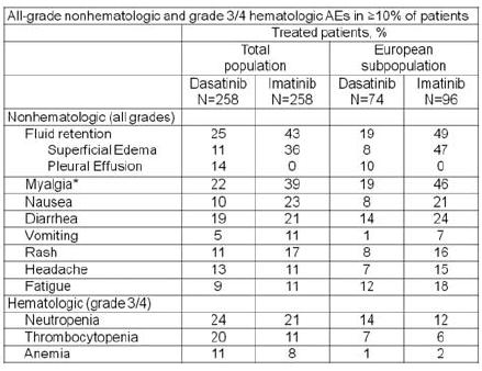 Background. In the phase 3 DASISION trial of dasatinib vs imatinib in patients with newly diagnosed CML-CP, dasatinib demonstrated higher 12-month rates of complete cytogenetic response (CCyR) and major molecular response (MMR), lower rates of transformation, and was well tolerated (Kantarjian NEJM 2010 362 2260). Aims. Assess efficacy and safety of dasatinib vs imatinib in European patients from DASISION. Methods. After informed consent, patients were randomized to dasatinib 100 mg once daily (n=259) or imatinib 400 mg once daily (n=260). 170 patients enrolled were from European countries (France: n=41; Spain: n=30; Czech Republic: n=22; Poland: n=20; Italy: n=14; Germany n=12; Belgium: n=9; Hungary: n=6; The Netherlands: n=6; Austria: n=4; Denmark: n=4; Greece: n=2), with 74 and 96 patients receiving dasatinib and imatinib, respectively. Primary endpoint was confirmed CCyR (cCCyR) by 12 months. Results. In the European subpopulation and total population, 82% vs 75% and 77% vs 66% of dasatinib vs imatinib patients achieved cCCyR by 12 months, respectively. After 24 months, 73% and 72% of European patients and 77% and 75% of total patients receiving dasatinib and imatinib, respectively, remained on therapy. Respective 24-month cumulative rates of MMR in the European subpopulation and total population for dasatinib vs imatinib were 61% vs 48% and 64% vs 46%, respectively. Median time to MMR calculated using competing risk analysis in European patients was shorter for dasatinib (12 months) than imatinib (30 months). Among European patients, no patient receiving dasatinib transformed to accelerated/blast phase (AP/BP) on study or during follow-up after discontinuation, compared with four (4.2%) patients receiving imatinib. In the total population, nine (3.5%) vs 15 (5.8%) patients receiving dasatinib vs imatinib transformed. Drug-related adverse events (AEs) are shown (Table 1). Grade 3/4 non-hematologic AE rates were ≤1%. For dasatinib vs imatinib, in the European population (total population), 43% vs 29% (59% vs 43%) had dose interruption, 22% vs 16% (28% vs 15%) had dose reduction, and 11% vs 6% (7% vs 5%) discontinued due to AEs. Minimum 36- month follow-up will be presented. Conclusions. After 24 months dasatinib showed higher efficacy compared with imatinib, lower transformations to AP/BP, and was generally well tolerated. The efficacy and safety of dasatinib in the European subpopulation was similar to the total population, supporting first-line dasatinib use in European patients with newly diagnosed CML-CP.