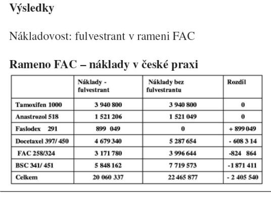 Náš tým se snažil vymanit z tohoto klišé, stanovil náklady pro hormonální léčbu fulvestrantem, přidaným do léčebného algoritmu karcinomu prsu a nahrazujícím chemoterapii, na základě reálných přímých nákladů celé terapeutické intervence nemocných léčených ve Fakultní nemocnici v Plzni.