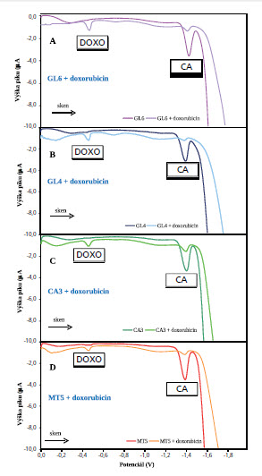 MT5, která má tři adeniny na konci a uprostřed řetězce, dává největší CA pík. CA3 se čtyřmi adeniny ve středu řetězce dává druhý největší CA pík. GL4 a GL6, které mají tři adeniny, vykazují píky stejné intenzity. Z toho vyplývá, že intenzita signálu závisí na počtu adeninů v sekvenci, ale nezávisí na poloze v řetězci. V dalším studiu byl sledován vliv primární struktury studovaných ssODN na potenciál píku. SW voltamogramy GL6, GL4, CA3 a MT5 (0.5 μg/ml) jsou na Obr. 1 A, B, C a D. CA píky při potenciálu -1,4 V se mění po přídavku 2,5 μg/ml doxorubicinu (měřeno po 90 min., 400 otáček, 25 °C). Tyto změny souvisí s interakcí doxorubicinu s ssODN. Dochází k poklesu výšky CA píku a objevuje se pík (DOXO) při potenciálu -0,4 V odpovídající doxorubicinu(Hynek, et al.).
