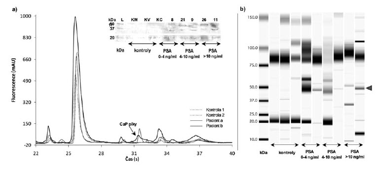a) kapilární čipové elektroforeogramy krevního séra pacientů a CaP a kontrolních jedinců v neredukujících podmínkách, šipky ukazují pozorované rozdíly. Ve výřezu: Western blot analyzovaných vzorků séra.