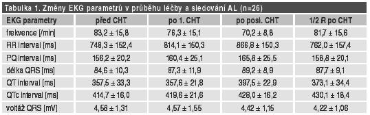 Po posl. CHT a 1/2 R po CHT došlo ke statisticky významnému prodloužení QTc intervalu ve srovnání se vstupní hodnotou (p<0,01). Prodloužený QTc interval nad 440 ms byl před CHT u 1, po 1. CHT u 3, po posl. CHT u 7 a 1/2 R po CHT u 9 pacientů. Ke snížení voltáže QRS o 1 a více mV oproti hodnotě před CHT došlo po 1. CHT u 3, po posl. CHT u 5 a 1/2 R po CHT u 6 pacientů. Prokázali jsme statisticky významnou korelaci mezi sníženou voltáží QRS, prodlouženým QTc intervalem na EKG a poruchou systolické a diastolické funkce LK na ECHO vyšetření. Repolarizační změny v souvislosti s prodělanou léčbou (nově vzniklé nebo zhoršení již vstupně existujících změn) byly 1/2 R po CHT přítomny u 9 pacientů.