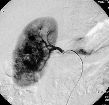 V první fázi výkonu provádíme přehlednou diagnostickou angiografii abdominální aorty a selektivní nástřik renální tepny k posouzení cévního zásobení postižené ledviny (časté jsou varianty v počtu zásobujících tepen).