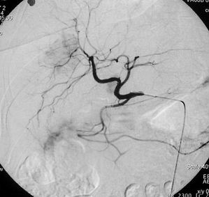 Obrázek 2 - angiografie a. hepatica před léčbou s patrnými hypervakularizovanými ložisky, které odpovídají metastázám