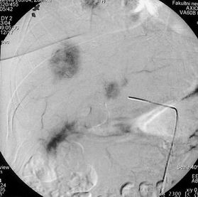 Obrázek 3 - angiografie a. hepatica před léčbou s patrnými hypervakularizovanými ložisky, které odpovídají metastázám