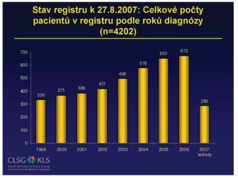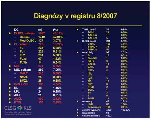 Jde o údaje z Národního onkologického registru (NOR), které jsou populační a nezabývají se histologickými podtypy lymfomů s rozdílným biologickým chováním a léčbou. Pro analýzu distribuce jednotlivých jednotek lymfomů bylo využito dat z registru Kooperativní lymfomové skupiny (KLS), které byly aktualizovány do srpna 2007. Kooperativní lymfomová skupina (Czech Lymphoma Study Group - CLSG) byla v ČR ustavena na základě domluvy skupiny pracovišť v roce 1998. Jedním jejím cílem bylo zřízení registru nemocných s NHL, který začal fungovat od roku 1999. Tento registr je zaměřen především na distribuci jednotlivých typů lymfomů, jejich charakteristiky a přežití.