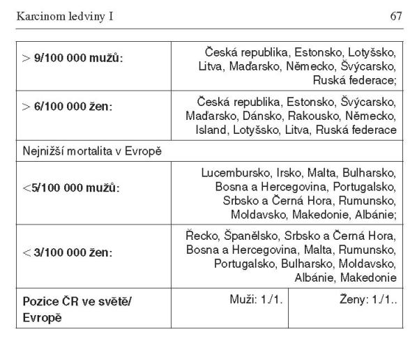Ledviny postihuje několik typů zhoubných nádorů, dominantní je karcinom tvořící v recentních datech NOR 72% všech nádorů ledvin. Nejčastější tzv. světlobuněčný (konvenční) karcinom tvoří v datech NOR 67% hlášených nádorů ledvin. Zřetelným problémem je vysoká agresivita ledvinových karcinomů. Více než 40% nemocných na toto onemocnění zemře. Nebezpečnost onemocnění dále zvyšuje schopnost těchto nádorů progredovat v dalším průběhu, a to i po mnoha letech od diagnózy. V důsledku vysoké incidence vede Česká republika v mezinárodním srovnání i u mortality. V roce 2005 zemřelo na nádory ledvin 720 mužů (4,6% všech úmrtí na maligní onemocnění) a 432 žen (3,5% úmrtí na maligní onemocnění). Přesto lze ve vývoji mortality vzhledem k incidenci pozorovat pozitivní trend, který je odrazem zvyšující se účinnosti léčby a také narůstajícího podílu včasně diagnostikovaných nádorů.