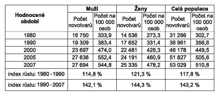 Tabulka 1. Vývoj incidence zhoubných novotvarů kromě kožních (C00-C97 bez C44) v ČR