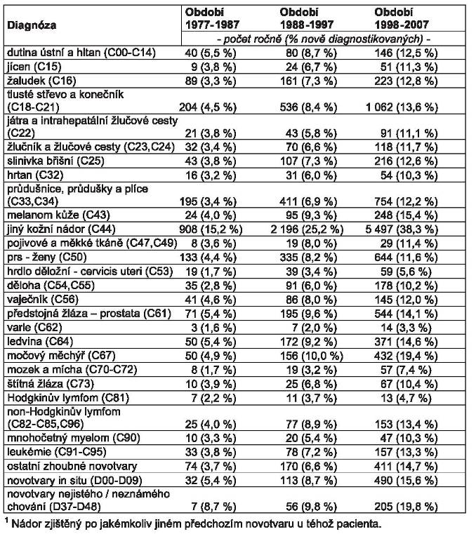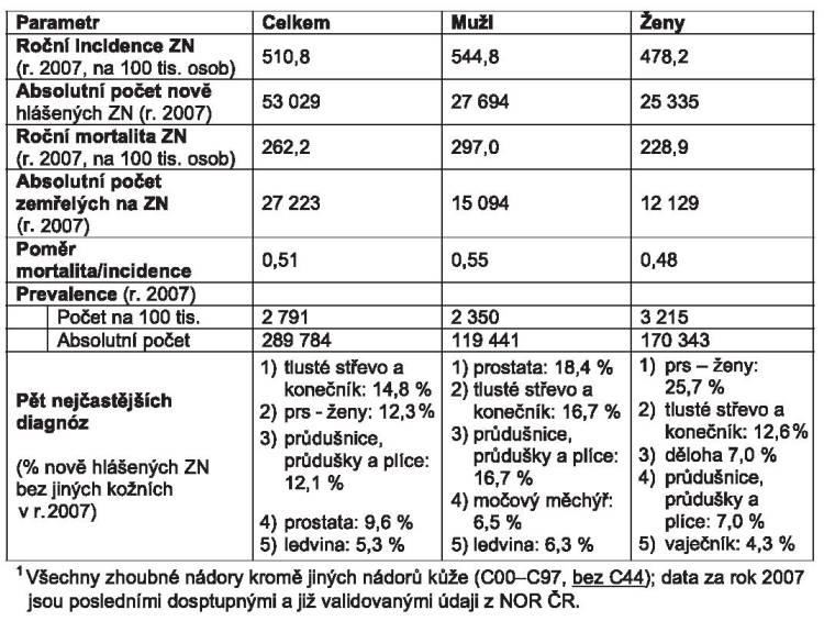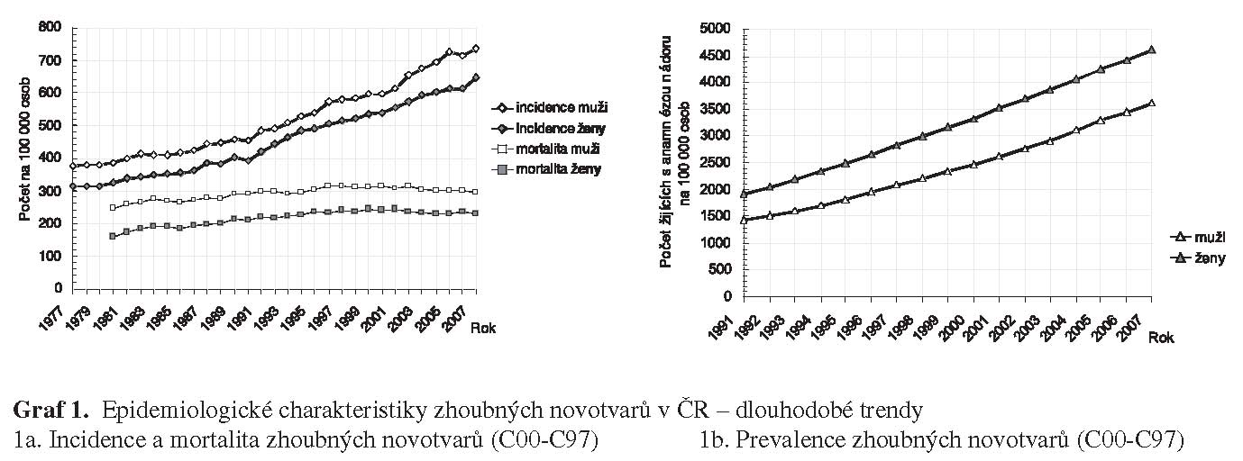 Zátěž české populace zhoubnými nádory patří k nejvyšším na světě a dále roste, jak dokumentuje tabulka 1. V období po roce 2000 dochází k viditelné stabilizaci mortality a rozcházející se trendy mortality a incidence přispívají k významnému nárůstu celkové prevalence (graf 1).