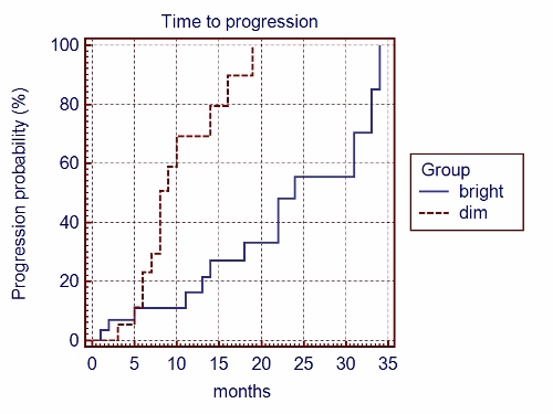 Results: According to the intensity of the flow cytometric expression of CD45 two groups were defined; low expression "dim" and higher expression "bright". Group parameters were compared to “dim” (n = 25) vs. "bright" (n = 46): median age 58 years (38-69) vs. 62 years (40-72) (p = 0.30), male / female ratio 13/12 vs. 24/22 (p = 1.0), unfavorable cytogenetics 16/21 (76%), r. 25/42 (60%) (p = 0.26), not surveyed cytogenetics in 16% pts. vs 9% pts., the frequency of CR after the 1st line treatment 3/25 vs. 8/46 (p = 0.73), the frequency of autologous SCT in 1st line 23/25 (92%) vs. 38/46 (83%) (p=0,48). Living patients 21/25 (84%) vs 43/46 (93%), median follow up by living patients was 11 months (1-40), vs. 20 months (1-98), median of progression 8 vs. 22 months (p= 0,0003). The probability of progression at 24 months was 100% vs. 52% (p = 0.0003).