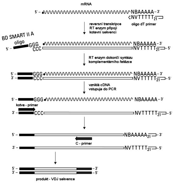 106 buněk. Izolace mRNA byla provedena pomocí izolačního kitu QIAGEN Oligotex® Direct mRNA Kit (Bio-Consult Laboratories, spol. s r. o., Praha, ČR) podle dodávaného protokolu. Výsledkem byla mmdvojice vzorků po 20 µl mRNA od obou pacientů. 3 µl mRNA byly použity do následné reversní transkripce, zbytek vzorku byl zamražen na –80°C. Pro provedení reversní transkripce mRNA do cDNA byl použit BD SMART™ RACE cDNA Amplification Kit (I.T.A.-Intertact, s.r.o., Praha, ČR) podle pokynů výrobce. Tato procedura zahrnuje přichycení kotvy (BD SMART II™ A) ke 3’-konci vznikající cDNA a to v dalším kroku umožňuje ohraničení požadované oblasti specifickými primery (viz Obr. 1).