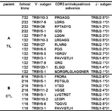 Tab. 1. znázorňuje zastoupení V a J subgenů a unikátních aminokyselinových sekvencí v jednotlivých klonech variabilní oblasti TCR u obou pacientů. V tabulce jsou uvedeny označení subgenů V a J podle mezinárodní nomenklatury IMGT, v prostředním sloupci je uvedena aminokyselinová sekvence oblasti CDR3 (complementarity determining region 3, IMGT). V případě pacienta A (TIL buňky) se podařilo analyzovat celkem 22 klonů, analýzou byl odhalen signifikantně frekventovaný klon s četností 7/22 tj. 31,8 %. V případě pacienta B (CTL buňky) se podařilo analyzovat celkem 16 klonů, analýzou byl odhalen signifikantně frekventovaný klon s četností 6/16 tj. 37,5 %. Ačkoli prozatím nelze ověřit, zda-li je soubor přibližně dvaceti prvků dostatečně velký pro stanovení validních závěrů, je zřetelné, že přibližně třetina T lymfocytů je specificky reaktivní vůči určitému antigenu. Nebyl ani pozorován zásadní rozdíl v tom, zda-li analýza byla provedena se vzorkem buněk TIL nebo CTL. Lze proto usuzovat, že oba typy buněk TIL i CTL jeví podobný potenciál reagovat na nádorový antigen. Pro ověření tohoto tvrzení bude zapotřebí provést další experimenty. Jednak otestovat TIL i CTL téhož pacienta k ověření zda stejný nádorově-reaktivní klon bude nalezen v obou typech buněk přítomných jak v nádorem infiltrované tkáni tak i v periferní krvi. K přesnějším závěrům by také přispělo rozšíření počtu analyzovaných klonů a nebo separování unikátních klonů jinou metodou než klonováním do bakterií, např. pomocí denaturační gradientové gelové elektroforézy (DGGE).