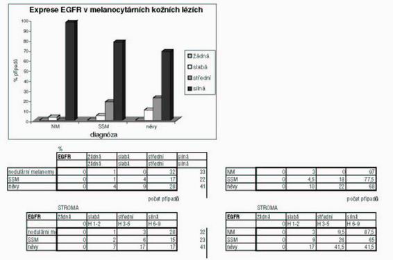 Do studie bylo zařazeno celkem 96 případů zahrnujících 33 nodulárních melanomů (NM), 23 superficiálních melanomů (SSM) a 41 pigmentových névů, zejména intradermálních a dermoepidermálních. Vyšetření bylo provedeno na tkáních fixovaných ve formalínu a zalitých do parafínu metodou nepřímé imunohistochemie v barvícím automatu Ventana Benchmark (Ventana Medical Systems S.A.), s použitím primární anti-EGFR prolátilátky (Fy Lab Vision Corporation, ředění 1:50) a AEC detekčního kitu. Hodnocení jsme prováděli semikvantitativně pomocí H-skóre (počet pozitivních buněk x intenzita zbarvení). Případy byly rozděleny do čtyř skupin: negativní, slabá exprese (H-skóre 1-2), střední exprese (H-skóre 3-5) a silná exprese (H-skóre 6-9). Výsledky byly statisticky analyzovány chi-kvadrát testem (p<0,05).