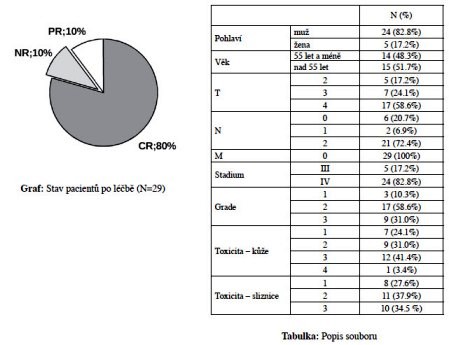 Kompletní remise bylo dosaženo u 80 % pacientů, parciální remise u 10 % a bez odpovědi zůstalo 10 % ze sledovaného souboru. Pacienti, kteří dosáhli kompletní remise po kombinované léčbě cetuximabem s radioterapií měli signifikantně vyšší expresi EGFR genu než pacienti s parciální nebo žádnou terapeutickou odpovědí. Mutace EGFRvIII byla nalezena u 21 % pacientů bez korelace k rezistenci na léčbu. Delece v exonu 19 EGFR genu byla detekována u 7 % pacientů a byl nalezen vztah ke špatné léčebné odpovědi. U 17 % pacientů byla nalezena mutace K-ras, kdy převládala mutace p.Gly12Cys. Přítomnost mutace p.Gly12Val byla asociována s rezistencí na léčbu, avšak byla nalezena pouze u jednoho pacienta.