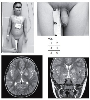 Chlapec ročník narození 2005 s negativní rodinnou onkologickou anamnézou byl léčen v roce 2006 pro uzlinovou formu histiocytózy z Langerhansových buněk kombinací prednisonu a vinblastinu, od roku října 2006 byl bez známek aktivity choroby v dispenzární péči. V listopadu 2011 ve věku 6 let se dostavil se známkami rozvíjejících se sekundárních pohlavních znaků: sekundární pohlavní ochlupení, zvětšení genitálu (objem varlat dle UZV 5-6 ml, Tannerovo stádium: PH 3/5, G3/5), zhrubnutí hlasu, bilaterální zvětšení prsní žlázy do velikosti areoly, akné (obr. 1, 2). Pomýšleli jsme na předčasnou pubertu podmíněnou hormonálně aktivním tumorem nebo na jinou endokrinologickou příčinu předčasného rozvoje sekundárních pohlavních znaků. Komplexní vyšetření zobrazovacími metodami (včetně celotělového FDG-PET) vyloučilo extrakraniální tumor. Byla zjištěna patologicky zvýšená hodnota hCG v séru i mozkomíšním moku odebraném lumbální punkcí: hCG 160 IU/l (sérum) respektive 157 IU/l (mok) a zvýšená hodnota testosteronu v séru 43,76 nmol/l. AFP bylo negativní. Následně provedený LH/RH test potvrdil supresi sekrece LH/FSH. Závěr endokrinologa: pseudopubertas preacox isosexualis. CT oblasti nadledvinek bylo negativní. Vyšetření mozku MR prokázalo ložisko zvýšeného signálu v T2 zobrazení o velikosti 16x16x17 mm v levých basálních ganglií (obr. 3 a 4).