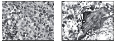 Stereotakticky navigovanou biopsií byl odebrán vzorek tkáně, ve kterém patolog potvrdil maligní germinální nádor typu germinomu se složkou syncitiotrofoblastu obsahující velké polygonální buňky v solidních ložiscích a hnízdech s velkými centrálně uloženými jádry (imunohistochemie: PLAP pozitivní; ostatní, tj. S100, AE1/AE3, LCA, NSE, synaptofyzin, AFP negativní; vysoké Ki67 90 %) (obr. 5 – barvení HE, zvětšeno 400x, obr. 6 – pozitivní průkaz syntitiotrofoblastu při imunohistoche v rámci CNS byla vyloučena. Dítě zahájilo léčbu dle protokolu ACNS 0232: chemoterapie s následnou radioterapií diferencovanou dle léčebné odpovědi, selektivní zvážení tzv. „second look operace“ po 2 a nebo 4 cyklech chemoterapie (3). K blokádě efektu testosteronu na cílových receptorech byl nasazen anti-androgen cyproteron acetát. U pacienta bylo zahájeno genetické šetření vzhledem k sekvenci 2 rozdílných malignit včetně vyšetření na průkaz mutace (dysfunkce) v obvyklých nádorově – supresorových genech či genech DNA reparačních systémů.