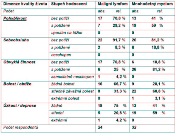 Dominujícími obtížemi u kohorty nemocných s maligním lymfomem jsou: 1. středně závažná bolest / obtíže 33,3% (8/24 respondentů), 2. pohyblivost s potížemi 29,2% (7/24 respondentů), 3. obvyklá činnost s potížemi 25% (6/24 respondentů), 4. středně závažná úzkost / deprese 20,8% (5/24 respondentů).