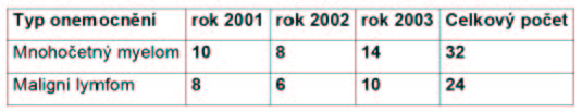 - data získaná v průběhu roku 2004 (září – prosinec) od 56 nemocných s mnohočetným myelomem a maligním lymfomem po transplantaci krvetvorných buněk. Studie byla schválena Etickou komisi Fakultní nemocnice v Hradci Králové.