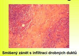 Ve vzorcích opakovaně nalezeny obrovskobuněčné granulomy se zánětlivým infiltrátem v okolí. Dále nalezena ztluštělá stěna duktů, tuková nekrosa.