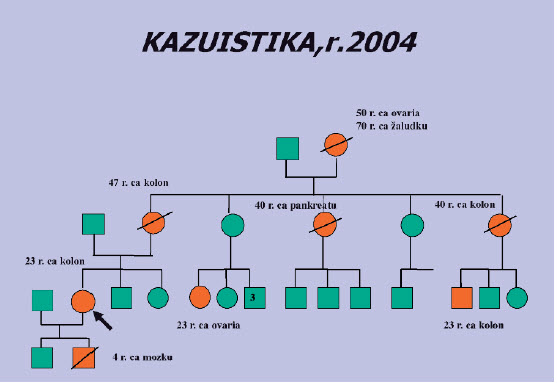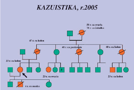 Obr. 1. Probandkou v rodině je žena, která onemocněla CRC ve 23 letech, kolonoskopie byla provedena po roce GIT obtíží i při významné rodinné anamnéze (RA) až na její žádost. V rodině nebyla splněna Amsterodamská kritéria k DNA vyšetření, molekulárně genetické vyšetření pro susp. HNPCC bylo zahájeno vzhledem k nízkému věku a RA. Sekvenační analýza genů MLH1 a MSH2 neodhalila kauzální mutaci.