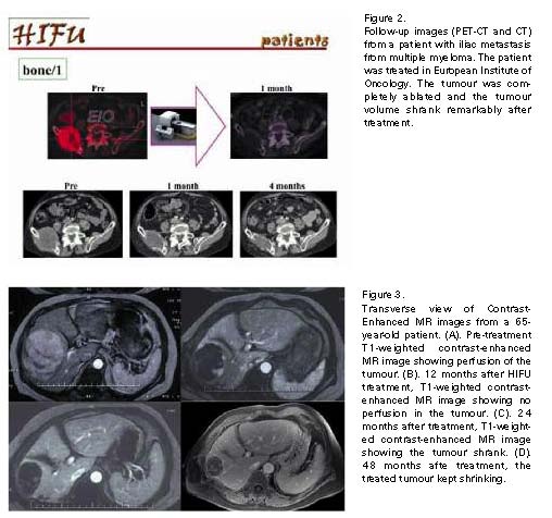 Recently, some research groups reported their results showing that HIFU ablation was safe, effective and feasible in treating human solid tumours345. The Group from Chongqing has reported the largest series of HIFU clinical applications to dáte, in which 1038 patients were treated with US guided HIFU in ten centers with both curative and palliative purposes6. Zhang et al.7 reported HIFU can achieve complete tumor necrosis even when the lesion is located adjacent to the major hepatic blood vessels. Indeed, there is no discernible damage to the major vessels, even though the adjacent tumor has been completely ablated. In Oxford, UK, a total of 22 patients with liver metastases were treated with USgHIFU. Using either radiological images such as MRI and contrast ultrasound, or histological examinations, 20 of 22 patients were assessed. The results revealed that the adverse event profile was favorable when compared to open or minimally invasive techniques8. This year, a feasiability study of ultrasonography imaging-guided high intensity focus ultrasound (HIFU) treatment for solid malignancies was completed in European Institute of Oncology (Milan, Italy)9; This will be the first report on HIFU treatment for solid malignant tumours from a European Comprehensive Cancer Center for defining clinical and technical indication for this technique.