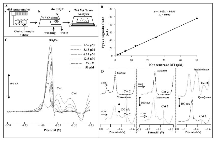 Metalothionein jako biomarker nádorového onemocnění byl sledován u pacientů s meduloblastomem (n = 10), neuroblastomem (n = 12), osteosarkomem (n = 8), Ewingovým sarkomem (n = 4) a anaplastickým ependymomem (n = 4). Kromě toho byla hladina MT stanovena také u zdravých jedinců (n = 58). Pro jeho detekci jsme zvolili v klinické praxi nezvyklé elektrochemické metody, které se vyznačují velkou sensitivitou, selektivitou a ekonomickou nenáročností. Dále jsme kladli důraz na automatizaci detekce, abychom metodu co nejvíce přiblížili potřebám klinické praxe na rychlé a standardizované laboratorní vyšetřovací metody. Pro tento úkol jsme použili ve střední Evropě ojedinělé přístrojové sestavy, která právě toto umožňuje při malé potřebě biologického materiálu.