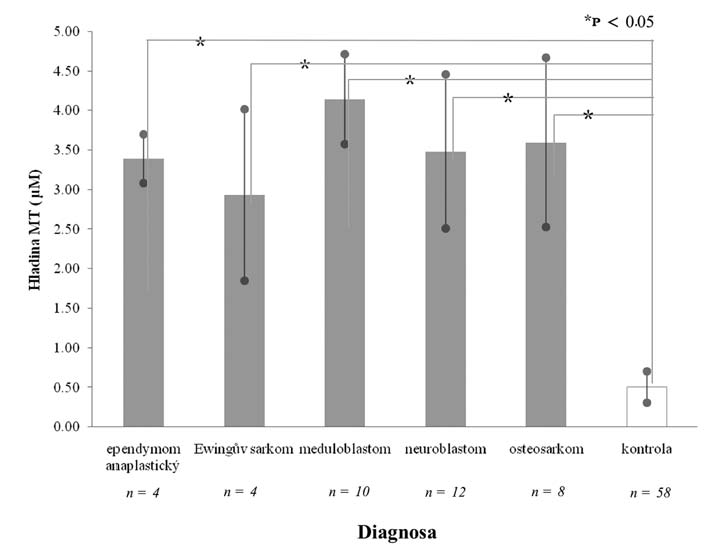 Průměrná hladina metalothioneinu u jednotlivých nádorových onemocnění (anaplastický ependymom, Ewingův sarkom, meduloblastom, neuroblastom, osteosarkom) a kontrol. Výsledky byly testovány na hladině významnosti p < 0.05 (t-test).